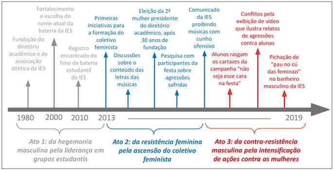 Apesar de trazermos informações da década de 1980 nessa linha do tempo, consideramos que nossa análise compreende substancialmente o período entre 2010 e 2019. Algumas datas foram suprimidas para proteger o anonimato dos participantes da pesquisa e da IES, bem como seus nomes, que foram substituídos por pseudônimos. Na seção seguinte, traremos das categorias que embasaram a análise de resultados, quais sejam: destacamos, no ato 1, a busca masculina por liderança, pela manutenção de poder e por prosperidade perante as mulheres; no ato 2, exploramos a formação do coletivo feminista, bem como seu propósito e combate ao machismo; no ato 3, aprofundamos nossa análise, com destaque para a visão dos rapazes sobre o coletivo feminista e ênfase nos ataques realizados contra esse movimento.