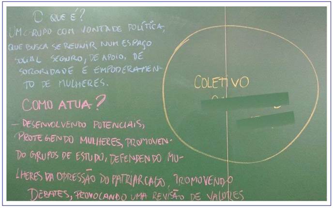 As primeiras conversas entre as alunas para a organização de um coletivo feminista no âmbito da IES ocorreram em 2013. No entanto, foi no ano de 2014 que o grupo passou a ser mais atuante, especialmente após combater letras ofensivas de músicas compostas pelos rapazes da bateria estudantil. A Figura 3 traz o registro de uma das primeiras reuniões do grupo, em que as fundadoras definiram seus principais propósitos: