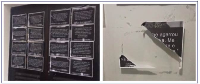 Os ataques ao movimento feminista não ficaram somente no âmbito do discurso. A campanha intitulada “Não seja esse cara nas festas” causou grande conflito entre os alunos da IES e foi boicotada por parte dos estudantes, que rasgaram os cartazes colocados nas dependências da instituição, em sinal de negação ao seu conteúdo (Figura 4). Patrícia relata que foi possível identificar quem rasgou os cartazes, pois o elevador tem câmera. Os rapazes envolvidos na situação não quiseram comentar o motivo de tal comportamento e, segundo Patrícia, eram estudantes que não tinham histórico de problemas relacionados com mau comportamento na IES.