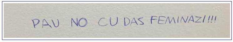 Como última fonte de dados, analisamos também artefatos presentes no interior da instituição de ensino superior (vii) entre os anos de 2017 e 2019. Tais artefatos incluem, principalmente, diversos cartazes colocados pelo coletivo feminista nas dependências da instituição, bem como sua adulteração e destruição por parte de rapazes, além de pichações feitas pelos jovens como forma de contrarresistência às moças que compõem o coletivo feminista. Uma dessas pichações foi localizada na cabine do banheiro masculino por um dos autores deste estudo.