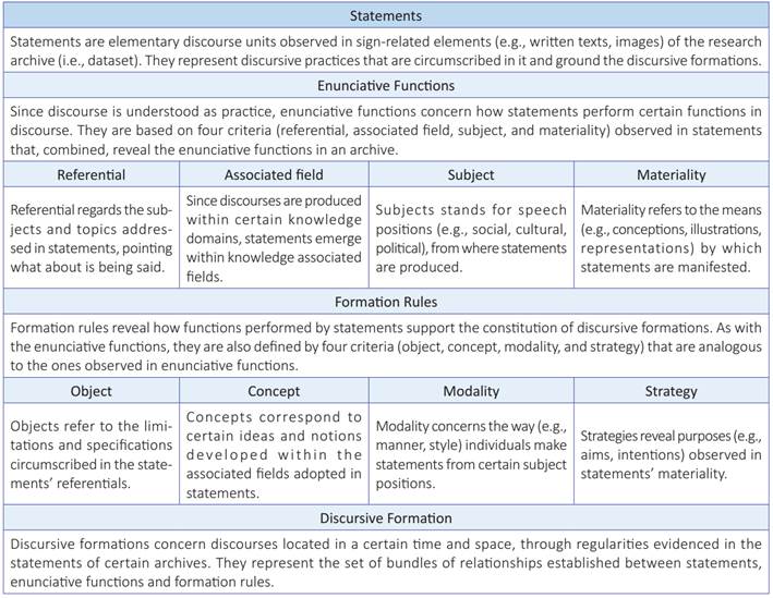The analysis of the aforementioned archive starts with the identification of statements in order to unravel discursive formations; such statements, in their turn, highlight certain functions, whereas discursive formations are established based on certain rules. It is worth to say that statements are identifiable in the signs of language, not being restricted to written texts, which allows them to be elicited from other types of texts, such as audiovisual ones (Foucault, 2014a). This analytical process is illustrated in Figure 1. Analytical categories, which form the basis of FDA, are defined in Box 1.