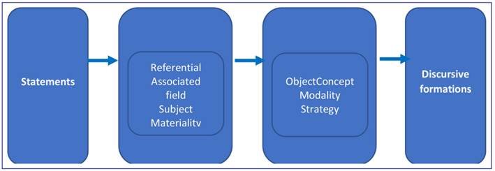 The system suggested by Souza-Leão (Souza-Leão & Costa, 2018; Souza-Leão & Moura, 2018), which establishes a logic of bundles of relationships among analysis categories, was herein adopted for research operationalization purposes. The analysis was based on statements’ inference, according to the qualitative coding logic, by taking into consideration the understanding of what actually features a statement. Based on this process, it was possible identifying associations among statements. Subsequently, criteria associated with functions observed in these statements were analyzed by identifying the syntagmatic chains that enable the definition of enunciative functions. Thus, statements can have different functions, just as a single enunciative function can be linked to more than one statement - that are typically related to each other, at least in part. Enunciative functions’ criteria are used to analyze formation rules’ criteria analogous to the first ones by identifying the syntagmatic chains that enable the definition of formation rules. Finally, the way rules are established, as well as the convergence of bundles of relationships in all categories, enable identifying discursive formations.