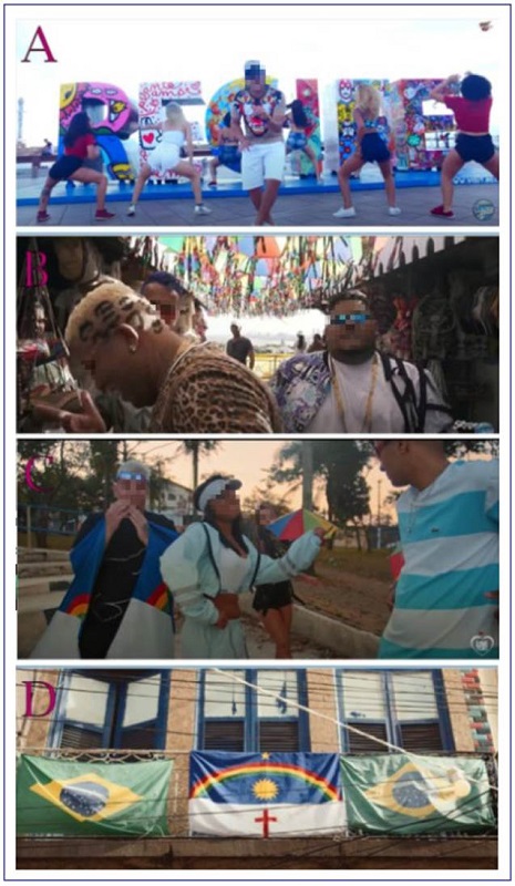 The appreciation of the Recife-related origin of bregafunk music (S06) shows that artists are proud of their hometown, as well as of the local origin of this genre, since they use local typical scenarios as locations for music videos or as part of the scenery. The images shown in Figure 10 illustrate this. In the first one (Figure 10A), a singer and dancers perform in front of the city’s name sign, located at Praça Rio Branco, ground zero of Recife, one of the most recognized tourist and cultural points of the city. In the sequence (Figure 10B), an artist is in one of the city’s public markets, which are traditional commercial and gastronomic strongholds in Recife. The third image (Figure 10C) shows a dancer of frevo - a local rhythm recognized as an Intangible Cultural Heritage of Humanity by the United Nations Educational, Scientific and Cultural Organization (UNESCO) - dressed in the characteristic dance outfit, which includes a typical parasol. Finally, the Pernambuco State flag - from where Recife is the capital -, which is one of the symbols most used by the locals as a demonstration of pride for their origin, is used by a person as a mantle in the same image (Figure 10C) and appears between Brazilian flags in the following one (Figure 10D).