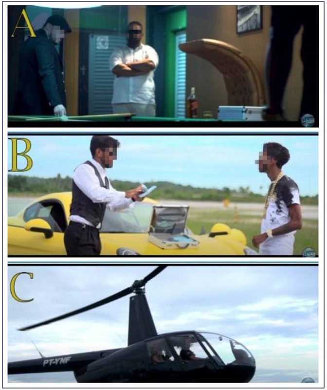 These music videos also depict the praise of ostentation as lifestyle (S08), since they associate the life of partying with the ostentation shown by artists through objects brought to the music videos. Figure 12 features frames from a music video that shows the ostentation of these artists through large amounts of cash, luxury clothes, jewelry, expensive drinks, a fancy car, and a helicopter. In the lyrics of the song, the relationship between the favela and a life of ostentation is evident: “for a long time I lived with sadness in my eyes, [...] I went to bed poor and woke up rich/I had my watch set with a diamond/and the pendant has the letter of my name”.