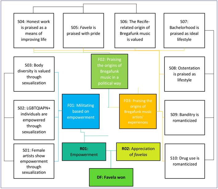 The third enunciative function lies on praising bregafunk music artists’ experiences and is linked to the appreciation of favelas (R02). Such enunciative function presents a series of situations that seek to legitimize the bregafunk music artists’ vision of the world and their way of life.
