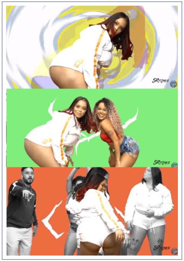 This enunciative function is associated with three statements. When female artists show empowerment through sexualization (S01), one can see the practices of bregafunk music singers who empower themselves by taking their place within a social context and a genre that traditionally exploits women. These artists express themselves as subjects by using their own bodies to show power through sensual dances, alluring moves, sexy body mannerisms, and sexualized discourses to validate their sexual freedom. In Figure 3, it is possible to see that the singer (in a white jacket) performs a provocative dance, with another woman by companion and the presence of a man with whom she interacts without any sexual connotation. In Figure 4, in turn, the singer (with a cap) demonstrates her sensuality through her body mannerisms and in the way she gazes at the camera. Again, another woman dances sensually, while a man participates without interacting with them in a sexualized way.