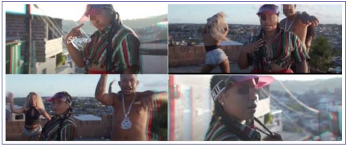 The romanticization of banditry (S09) also shows an idealized perspective in these music videos since it brings the idea of carrying weapons as demonstration of power and social status by these artists. Figure 13 presents a scene (originally horizontal in the music video) that show this aesthetic, in which firearms are simulated with hands in an intimidating way.