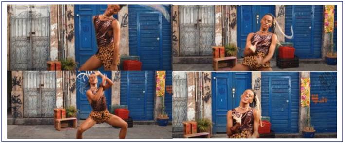 On the other hand, when members of the LGBTQIAPN+ community are empowered through sexualization (S02), one can observe that those who escape the heteronormative pattern are empowered by establishing themselves as attractive individuals in music videos. It is possible seeing this sexual activism in moves that emphasize these individuals’ self-love, such as flipping their hair, looking at someone in a seductive manner, and dancing for the camera or in the presence of symbols that refer to LGBTQIAPN+ rights, such as flags or female accessories used by men (e.g., makeup, women’s clothing, or wigs). In Figure 5, a person who escapes the cis heteronormative pattern presents themselves spontaneously - unlike the very commonly caricaturized way adopted to represent LGBTQIAPN+ people - appropriating the typical dance of the genre (i.e., passinho) in a sexually attractive manner.