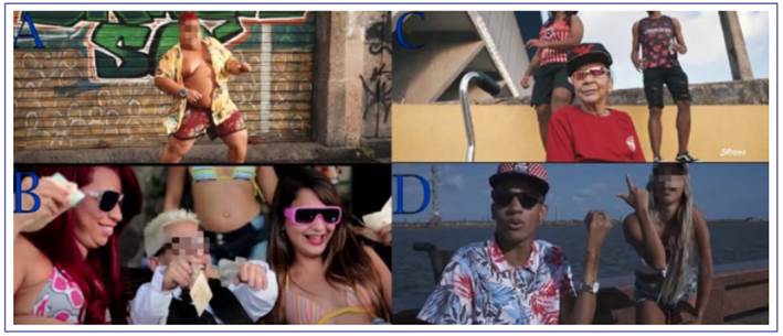Finally, body diversity is valued through and amidst sexualization (S03) when men and women with old people, fat bodies, dwarfism or some type of body disability appear in contexts that also show their pride in these productions. This diversity can be seen both in artists who escape the socially accepted body standard and in individuals with different body shapes who are shown in music videos produced by artists presenting “standard” sexy bodies. The first situation can be evidenced by the singers shown in Figures 3 and 4, while the latter through images in Figure 6. In the first image (Figure 6A), a fat teenager dances the passinho sensually; below it (Figure 6B), a man with dwarfism is placed among women who represent standard female bodies; in another image (Figure 6C) an elderly woman is inserted in an environment where young people dance to the bregafunk music rhythm; finally, a physically disabled person participates in the music video on his wheelchair beside a women that also represents a standard female body (Figure 6D).