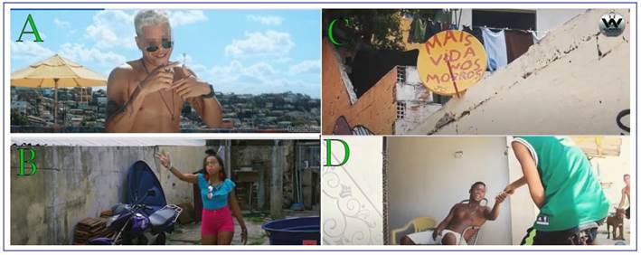 The second statement associated to the present enunciative function evidences how favelas are praised with pride (S05), since it shows that experiences lived in the outskirts are used in media productions’ aesthetics and narratives. This discourse brings artists’ speeches of pride towards favelas, when they praise Recife City’s outskirts by using them as recurring scenario in their music video productions, or by using their experiences as storytelling tool. Figure 9 illustrates it. Its first image (Figure 8A) shows an artist with the favela in the background, characterizing him as a local resident; below it (Figure 8B), a frame of a music video whose narrative presents the favela by the steps of a resident who walks through the place; in another image (Figure 8C) a political phrase (“more life on the hills”) calls for better conditions for living as a demand for respect for the favela and its residents; finally, the artist of one of the music videos walks through the favela interacting with residents of the community (Figure 8D).