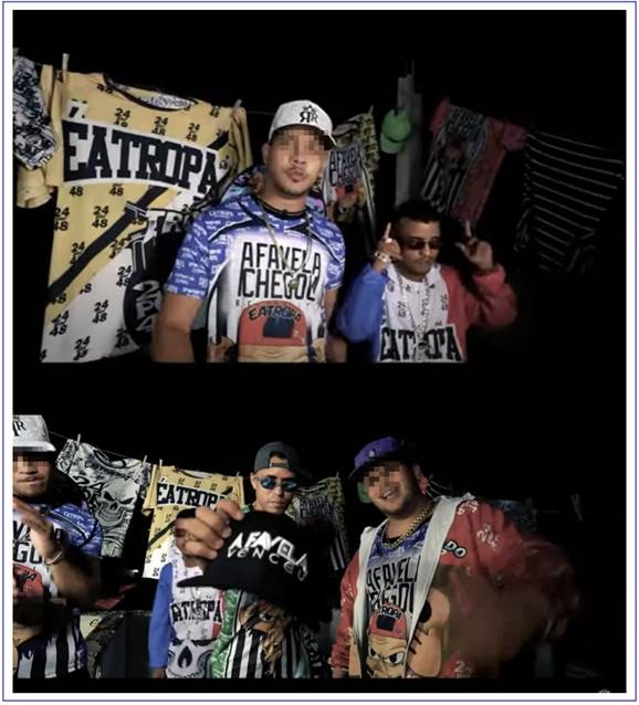 This situation can be illustrated through Figure 9, in which bregafunk music artists dress up in t-shirts that print watchwords (i.e., “favela arrived” and “favela won”), while singing about themselves as undervalued favela youths who succeed by means of the genre’s art scene.