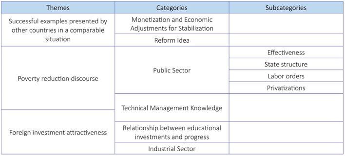 Due to external events and the changes introduced in the Brazilian State apparatus after 1992, it is possible to identify some elements of analysis from the perspective of development management through the set of actions of the World Bank. Based on these initial prerogatives, the documents from this year onwards were considered outstanding concerning the country’s development plan due to three primary initial aspects. These are categorized into three key ideas: successful examples presented by other countries in a comparable situation, poverty reduction discourse, and the attractiveness for foreign investments. These themes guided the categories found in the analysis of documents according to the following organization of categories and subcategories:
