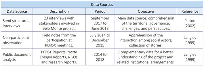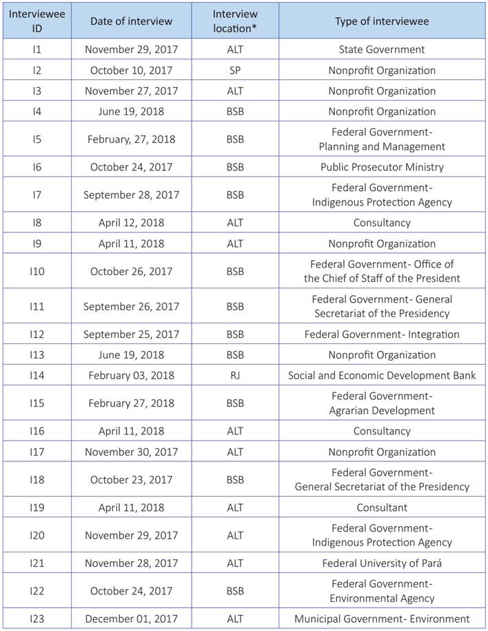 Primary data was collected through 23 semi-structured interviews conducted by a team of researchers from the Center for Sustainability Studies at the Fundação Getulio Vargas under a research project coordinated by the first author of this paper. Prior to commencing the interview, researchers asked for permission to digitally record the conversation, transcribe it later, and anonymously quote the interviewees in written documents, fully safeguarding their confidentiality. The interviews occurred between September 2017 and June 2018 and lasted between 1 and 2 hours. Secondary data was collected through documentary analysis and non-participant observation to help understand the phenomena (Langley, 1999). The documentary analysis comprised public documents related to Belo Monte licensing process and the PDRSX process. The non-participant observation took place through the presence of one of the authors in monthly plenary meetings of the Xingu Sustainable Regional Development Plan Management Committee between July 2014 and December 2015.