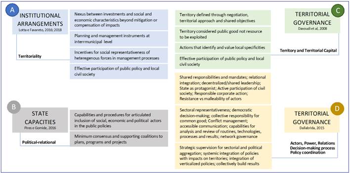 The emphasis on the territorial approach has emerged in recent decades in Brazil and Latin America and explored as a new characteristic and perspective of policies and development processes, seeking to promote the specificities of territories and incorporate demands and voices of the social forces of the territories into public policies and political resistance (Berdegué, Escobal, & Bebbington, 2015; Lotta & Favareto, 2018; Saquet, 2018). Others discuss territorial governance processes, placing territorial heritage or capital as a constitutive element of public action (Dallabrida, 2020; Davoudi, Evans, Governa, & Santangelo, 2008). This emphasis is supported by academics coming from different fields of knowledge (rural development, public administration, organizational theory, and human geography) who stress that territories - or places - are constitutive of the formulation and implementation of policies, programs, and projects (Berdegué et al., 2015; Dallabrida, 2020; Pollitt, 2015; Saquet & Bozzano, 2020; Spink, 2015).