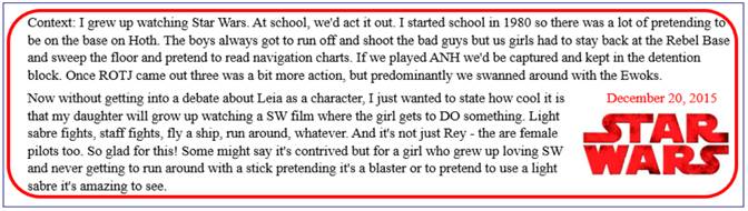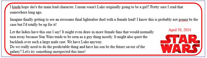 The highlighted message (see Figure 1) presents a comment from a fan that opens the topic called “How great to have a female lead!”, published in December 2015 to address the marketing and cultural importance of having a Female Jedi.