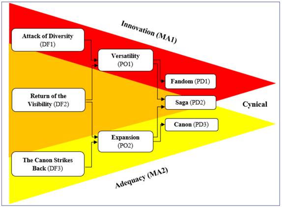 Both diagrams are formulated by the power operator that deals with expansion (PO2). It is a movement whose opening space for political identities in new productions of the saga is discussed as the likelihood to expand one of the most celebrated media products of pop culture. On the one hand, the Sequel Trilogy is discussed as a cinematographic production (differentiation system) focused on adapting itself to the market (objective type). On the other hand, because it is a new production in the franchise (differentiation system), its development (objective type) must be implemented as the continuity of the aspects enshrined in previous productions. Both strands establish respect to the canon (instrumental modality), through canonical foundations (institutionalization form), in order to maintain (rationalization degree) the established values.