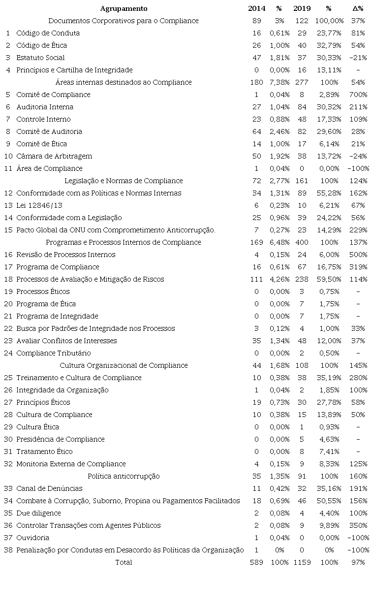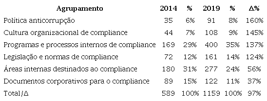 Em termos gerais, houve um aumento de 97% na ocorrência de temas relacionados ao compliance nos relatórios de administração das companhias analisadas no ano de 2019 em comparação a 2014. Observa-se que a variação entre os anos analisados e a quantidade absoluta de ocorrências por categoria deu-se principalmente pela ampliação na abordagem de política anticorrupção; cultura organizacional de compliance; programas e processos internos de compliance; e legislação e normas de compliance.
