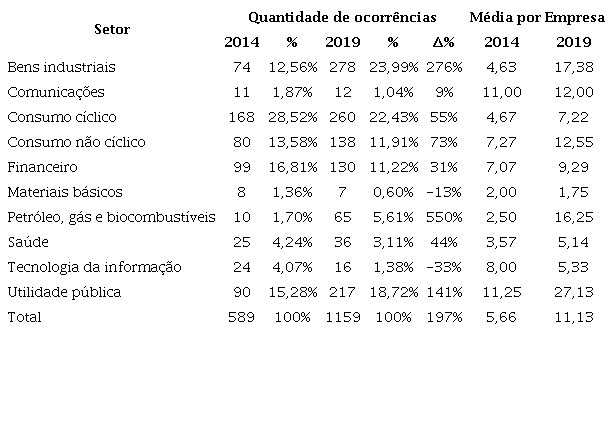 De modo a prover explicações para a evolução na divulgação de compliance das companhias analisadas, realizou-se a análise de setores e companhias com maior evolução nesse aspecto. Na Tabela 2, é apresentada a análise de ocorrências relacionadas aos setores.