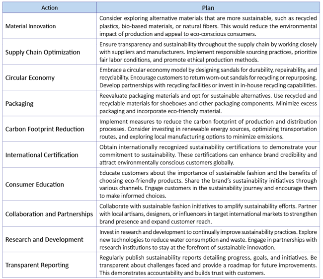 In the same direction, invest in Regulatory Compliance (Prooijen et al., 2021). attributes could create an alignment to local and international regulations related to environmental standards, labor practices, and product safety. By meeting or exceeding these requirements, Melissa sandals could ensure compliance and minimize potential market entry barriers in different countries. In terms of Brand Reputation and Trust (Martínez-Ferrero & García-Sánchez, 2018), sustainability attributes can contribute to building a positive brand reputation and fostering trust among consumers, retailers, and other stakeholders. International consumers often rely on established and reputable brands when making purchasing decisions. By positioning themselves as a sustainable brand, Melissa sandals can enhance their image and credibility in new markets, facilitating international expansion. Bu the end, create a Consumer Awareness and Education (D. Shen et al., 2013) through marketing campaigns, partnerships, and engagement with local communities, the brand could promote sustainable practices and encourage consumers to make more informed and environmentally friendly choices. This can help build a loyal customer base and drive long-term growth in international markets.