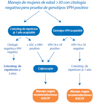 Como se puede apreciar en el algoritmo, si estamos ante el caso de una mujer mayor de 30 años en la que la citología es normal, pero la prueba de VPH es positiva, tenemos dos opciones: