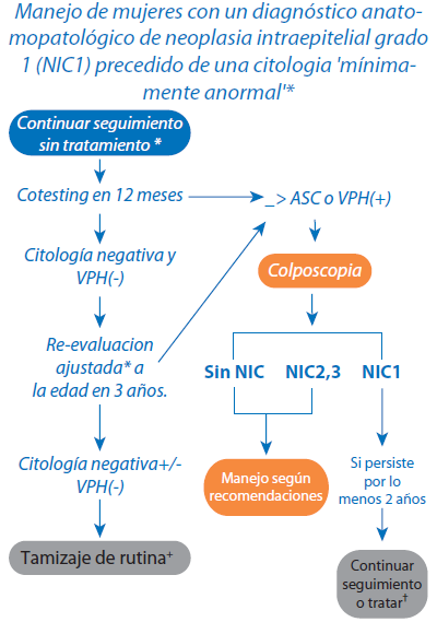∞ + El manejo varia si la mujer está embarazada o edad entre 21 a 24; citología si edad <30 años, cotesting si edad ≥30 años