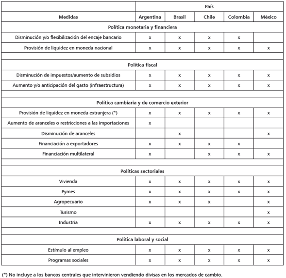 Por ende, los esfuerzos de las políticas públicas adoptadas por estos países ante las crisis económicas y sociales se encaminan en varios frentes: a) sostenimiento de las fuentes generadoras de empleo; b) desarrollo de reformas tributarias (carga impositiva); c) estimulación de la producción industrial y agropecuaria, a través de créditos con tasas moderadas, acciones económicas y fiscales a largo plazo; d) disciplina fiscal en temas de déficit y gasto público, y e) infraestructura social y económica-productiva; la primera, enfocada a mejorar las condiciones habitacionales, como vivienda, agua, riego, drenaje y saneamiento; la segunda, orientada a comunicación y transporte (mantenimiento y extensión de la red vial, puentes, conexiones viales, puertos, ferrocarriles, transporte urbano e interurbano, aeropuertos), energía (generación y transporte de energía eléctrica y renovable y minería) y medioambiente (gestión y conservación de recursos naturales).
