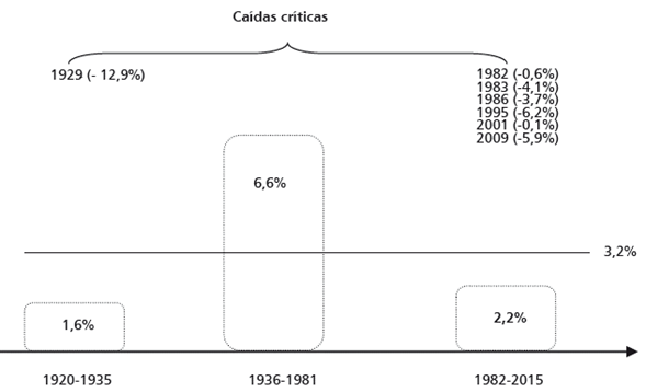 En los últimos cien años el crecimiento económico en México ha sido muy irregular, lo que se asocia con las transformaciones que el país ha sufrido: pasó de ser un país eminentemente rural con escasa presencia urbana a uno semiindustrializado con una notoria concentración de su población viviendo en ciudades. El crecimiento, por supuesto, también ha sido el resultado de las políticas elaboradas por los distintos gobiernos y de todos los cambios sociales, políticos y económicos experimentados. De esta manera, en concreto, podemos distinguir tres momentos o fases de crecimiento representados por estos periodos: 1920-1935, 1936-1981 y 1982-2015 (gráfica 1).