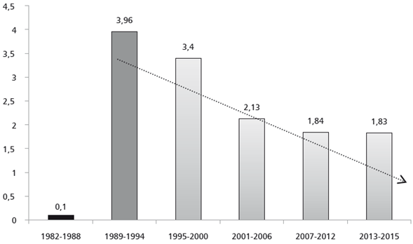 Se llega así a la tercera etapa, que abarca de 1982 a 2015, en la que el promedio anual de crecimiento ha sido muy bajo: 2,2%. Ello regresa la economía al escenario de principios del siglo XX, pues nuevamente experimenta estancamiento económico. Los rasgos más importantes del actual periodo son la apertura comercial, el abandono de la estrategia de industrialización y la implementación de políticas de desregulación y desestatización. En su momento, esto fue consistente con las fallas que se observaron en el periodo anterior, pero, al sostenerse en el tiempo, han llevado a que el problema del crecimiento sea de naturaleza estructural. Particularmente grave, para el enfoque que se privilegia, es la incapacidad para crear una industria nacional innovadora y con un fuerte componente científico-tecnológico (Sánchez y García, 2015).