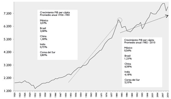 La primera se inicia con el fin de la revolución armada en 1920 y termina en 1935, año en el que inicia formalmente el proceso de industrialización del país. Como consecuencia de la débil estructura productiva nacional, la incertidumbre política y la elevada dependencia de los sectores primarios, el promedio de crecimiento anual durante este periodo fue de apenas 1,6%. Dicho crecimiento también se vio afectado por la crisis de 1929; de hecho, en 1932 la economía decreció 12,9% (Rodríguez, 2007, p. 23).