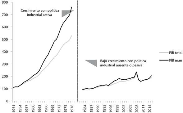 [Desde mediados de los ochenta], el incremento de la productividad laboral se alcanzó mediante la reducción de la tasa de crecimiento del personal ocupado, mientras que bajo el modelo económico precedente [crecimiento con política industrial activa] [...] el incremento de la productividad laboral ocurrió simultáneamente con un incremento [...] del empleo manufacturero (pp. 18-19).