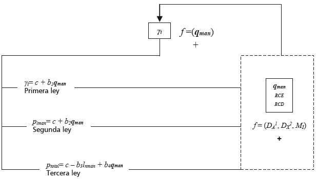 Kaldor estableció formalmente un modelo de crecimiento consistente en tres leyes. La primera y más relevante para este trabajo indica que los cambios en la producción total -o bien, en la producción no manufacturera- pueden explicarse por los cambios de la producción manufacturera; es la hipótesis de la industria manufacturera como motor del crecimiento. La segunda, atribuida originalmente a Verdoorn, considera que la productividad manufacturera es endógena y se explica por la producción de ese sector, gracias a los rendimientos a escala dinámicos y estáticos. La tercera implica que existe una relación de causalidad positiva entre la producción manufacturera y el crecimiento de la productividad fuera del sector manufacturero, debido a los rendimientos decrecientes en la agricultura y en muchas actividades poco relevantes del sector servicios que ofertan trabajo al sector industrial. Respecto a esto último, si el producto marginal del trabajo es inferior al producto promedio en esos sectores, el producto promedio (la productividad) crece a medida que el empleo aumenta. De esta forma, la producción total disminuye a medida que la expectativa de absorber trabajo de las actividades con rendimientos decrecientes se diluye3.