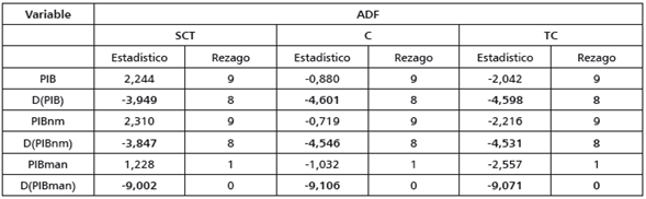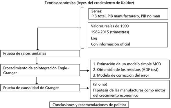 Se utilizó un grupo de series de tiempo para verificar la causalidad entre las variables de interés; este se integró por los logaritmos del PIB total, PIB no manufacturero y PIB manufacturero, en valores reales de 1993, del primer trimestre de 1982 al segundo trimestre del 2015. Con las series se siguieron tres etapas: en la primera se analizó la estacionariedad (prueba de Dicky-Fuller aumentada, tabla 1); en la segunda, la cointegración (procedimiento de Engle y Granger, tabla 2); y en la tercera se indagó la relación y dirección de causalidad (prueba de Granger, tabla 3) (Asteriou y Hall, 2006). La información es oficial y se encuentra disponible para su descarga en el Banco de Información Económica del Instituto Nacional de Estadística y Geografía de México (figura 2).