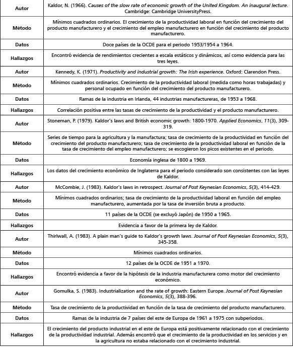 En Kaldor (1966), la expansión del sector manufacturero es concebida como la fuerza principal del crecimiento económico. La expansión se conduce en una primera etapa por la demanda proveniente del sector agrícola, para relacionarse en una etapa posterior con el crecimiento de las exportaciones. Kaldor (1970) desarrolló un poco más la explicación en relación con los factores detrás del crecimiento manufacturero: subrayó la importancia que tienen las fuerzas de demanda que conducen a un incremento de la productividad, vía la ley Verdoorn (1949). Para Kaldor (1970), la productividad manufacturera responde positivamente a los cambios del producto manufacturero, y estos últimos también conducen a incrementos de la producción global, con lo cual se establece un proceso de causación acumulativa2.