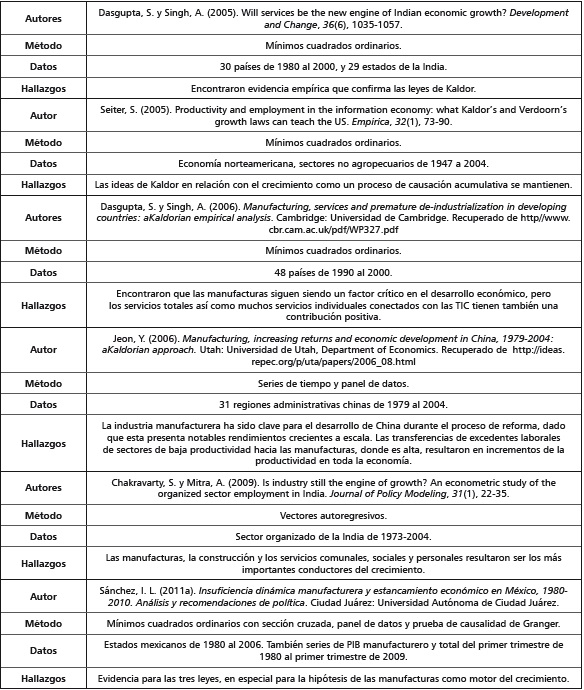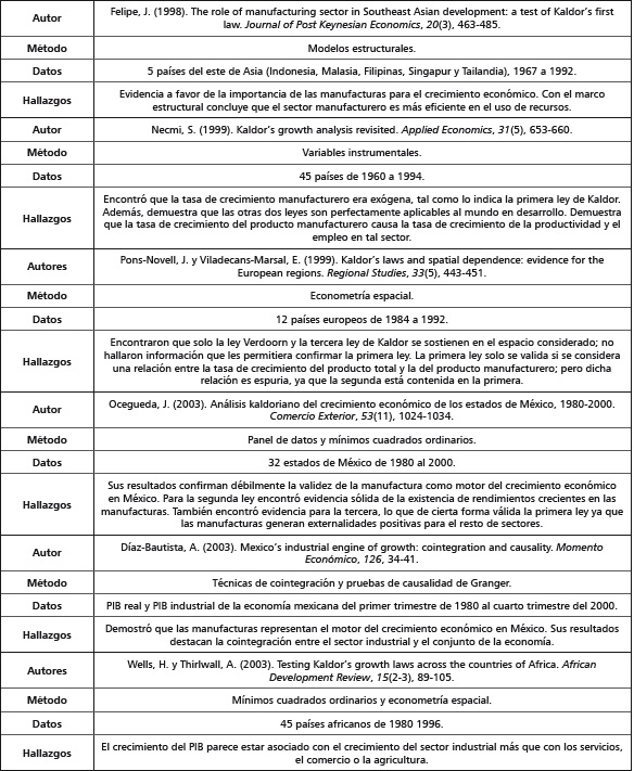 Hasta aquí se espera que el lector considere que el bajo crecimiento de la economía mexicana puede explicarse por la desaceleración de las industrias manufactureras. De aquí la importancia de estudiar la política industrial implementada, criticarla y proponer una nueva que reactive dichas actividades; pero antes se debe demostrar la hipótesis de investigación, al menos parcialmente, ya que en la ciencia económica no existen absolutos. De hecho, existen explicaciones alternativas del problema que se enfrenta; a continuación se expone un resumen de dicha literatura empírica.