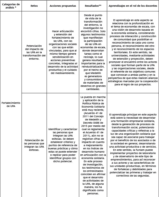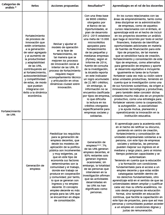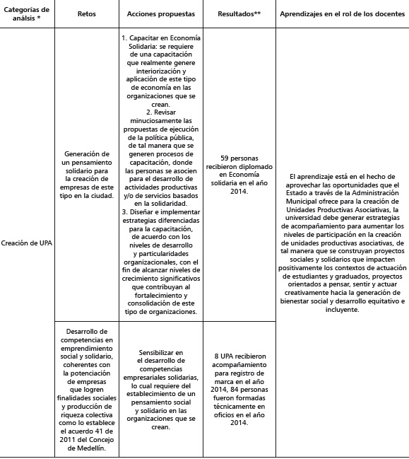 Teniendo en cuenta los indicadores contenidos en los últimos dos planes de desarrollo de la ciudad de Medellín (2008-2011 y 2012-2015) para la creación, el fortalecimiento y la consolidación de Unidades Productivas Asociativas (UPA), la aplicación de la Política Pública de Economía Social y Solidaria en la ciudad se encuentra ahora frente a una nueva etapa que resultará decisiva para determinar el verdadero aporte a la superación de problemáticas sociales y generación de desarrollo equitativo e incluyente. Esto demandará ya no solo proporcionar las condiciones necesarias para el surgimiento de estas iniciativas, sino lograr su consolidación y hacer frente a importantes retos que se pueden ver en mayor detalle en el anexo 1