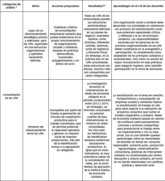 Todos los beneficiarios han recibido capacitación en materia de emprendimiento, capacitación administrativa, técnica, legal, contable, mercadeo, así como de buenas prácticas de economía solidaria; sin embargo, la investigación identificó deficiencias relacionadas con aspectos esenciales en la gestión empresarial solidaria, como el objeto social, la base asociativa, el proceso de formalización, los grupos de interés e incluso los principios del cooperativismo. A partir de esta situación podría intuirse que el aprendizaje ha sido en gran medida reactivo y, por ende, sugiere la necesidad de emprender acciones encaminadas a reforzar este proceso, algo que no resultará sencillo, teniendo en cuenta las carencias educativas de gran parte de la población vinculada, pero que sin duda se torna vital para el desarrollo de las UPA.