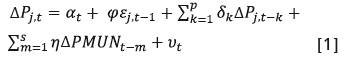 En especial, definamos el vector de precios para la ciudad j como , donde Pj,t es el precio del café minorista para el periodo t en la ciudad j (jЄ{"Barranquilla", Bogotá", "Cali", "Cartagena", Medellín"}) y PMUNt corresponde al precio mundial del café en el periodo t. La ecuación del modelo de corrección de errores que muestra el ajuste del precio de la ciudad j a desequilibrios de largo plazo será:
