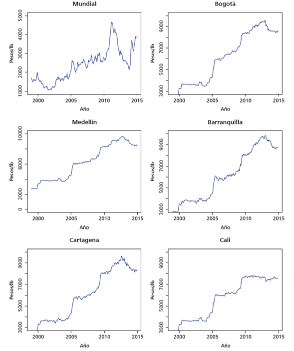 Como se muestra en la gráfica 1, los precios minoristas del café para las ciudades de Colombia exhiben el mismo patrón de crecimiento a lo largo de los 16 años estudiados: se observan saltos de nivel aproximadamente cada 5 años. En comparación con el precio mundial, la volatilidad de estas (con excepción del precio de Cali) es mayor, puesto que el coeficiente de variación es de 36,3% para Medellín, y mayor a 37% para Barranquilla, Bogotá y Cartagena, mientras que el coeficiente de variación del precio mundial del café es de 35,8%.