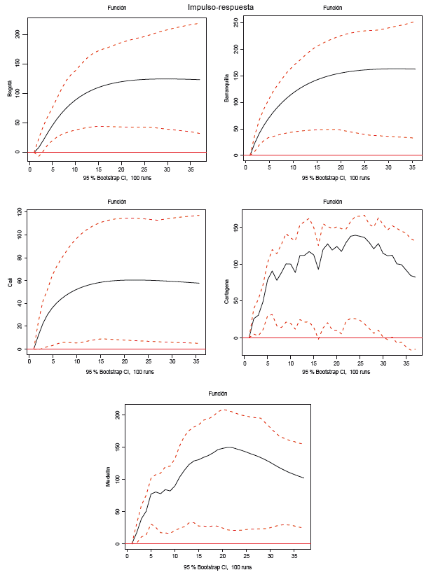 A partir de los resultados anteriores, se realizaron las funciones de impulso y respuesta (gráfica 2). Se observa que un choque inesperado de un peso en el precio del café mundial tiene un efecto persistente que desaparece lentamente 36 o más meses después, en el caso de Barranquilla y Medellín. Para Bogotá y Cali sucede algo similar, solo que los efectos se empiezan a observar en el tercer mes. Por último, para Cartagena los cambios desaparecen temporalmente en el mes 15 y 31, y lo hacen de manera definitiva a partir del mes 33. Asimismo, se observa que los efectos en los precios del café minorista varían en cuanto a la magnitud: son mayores para Barranquilla y Medellín, cuyo máximo se encuentra alrededor de los 163 y 149 pesos, respectivamente, mientras que en Cali el máximo está aproximadamente en 60 pesos.