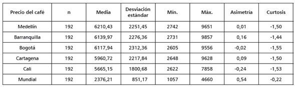Las estadísticas descriptivas de las series del café para las ciudades son similares (tabla 1); sin embargo, el precio del café al minorista en Cali presenta una desviación estándar más pequeña y un precio máximo que es en casi 2000 pesos a los precios de las otras ciudades.