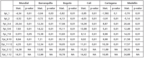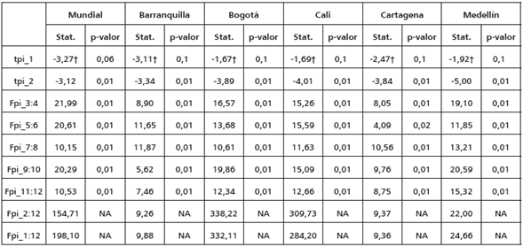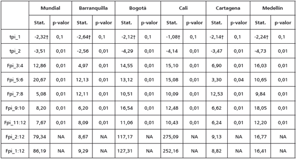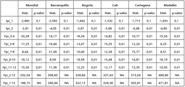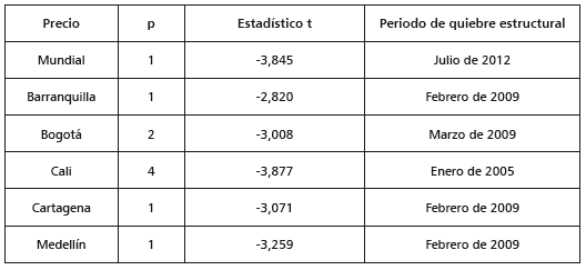 En los anexos se encuentran los resultados de aplicar las pruebas de raíces unitarias Zivot y Andrews (1992) y HEGY (Hylleberg et al., 1990). En la primera se observa que todas las series tienen un posible quiebre estructural: enero de 2005 para Cali, febrero de 2009 para Barranquilla, Cartagena y Medellín, marzo de 2009 para Bogotá y julio de 2012 para la serie mundial. Este quiebre estructural es tanto de la pendiente como del intercepto para todas las series, excepto para el precio del café de Cali, donde solo el intercepto fue significativo. Además, en todas las series no se rechaza la hipótesis nula de presencia de raíz unitaria. Para la prueba de HEGY, no se rechaza la hipótesis nula de raíz unitaria convencional y se rechazan todas las otras hipótesis con un 99% de confianza; es decir, no se encuentran raíces unitarias estacionales.