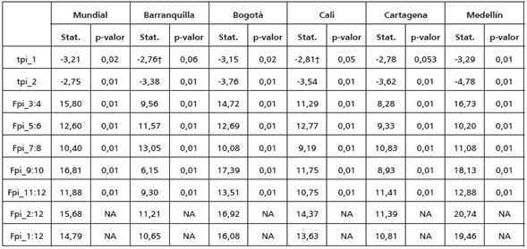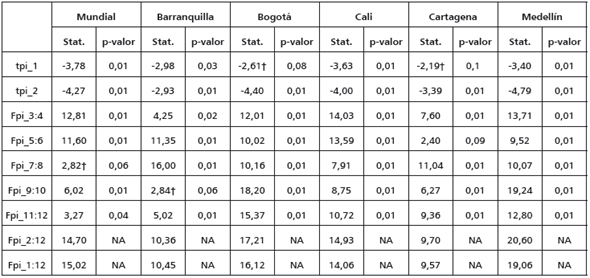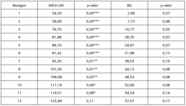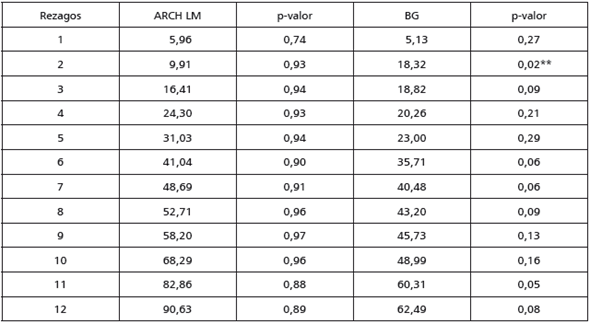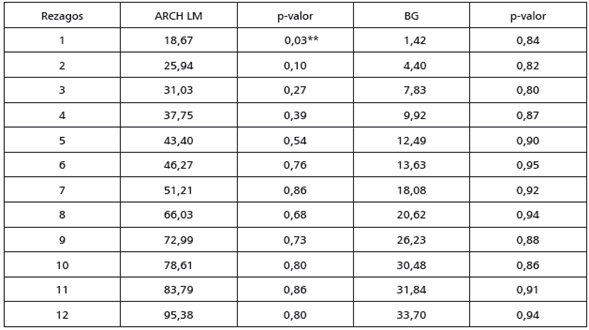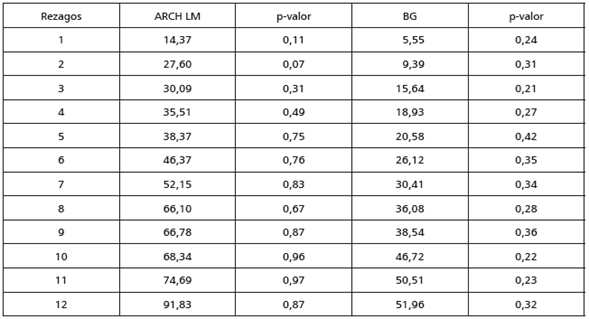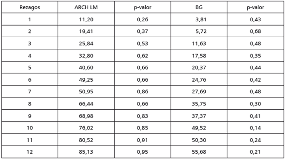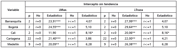Para realizar la prueba de cointegración de Johansen (1988), se estima un modelo VAR para cada ciudad. Se establece el número de rezagos empleando criterios de información y posteriormente se realizan pruebas de autocorrelación y heteroscedasticidad para cada modelo. En todos los casos se logran obtener modelos VAR libres de autocorrelación, y solo en el caso de los modelos VAR para Cali y Cartagena las pruebas de ARCH LM y Breush-Godfrey señalan signos de heterocedasticidad condicional (ver anexos).