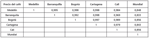 Por otra parte, en la tabla 2 se observa una alta correlación positiva entre el precio mundial del café y el precio del café en las cinco ciudades analizadas. Lo anterior podría indicar que hay una relación de comovimiento entre las series, o bien, podría ser una relación espuria. Esta será verificada formalmente utilizando las pruebas de cointegración más adelante.