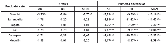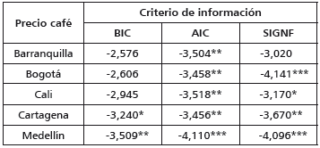 Para las segundas diferencias, solo para el caso de Cartagena se observa la presencia de una segunda raíz unitaria convencional bajo el criterio AIC y SIGNF; no obstante, dados los resultados obtenidos en las cinco pruebas anteriores para las primeras diferencias, se decidió que esta serie era integrada de orden uno. Así, todas las seis pruebas de raíces unitarias permiten concluir que las series son I(1). En otras palabras, los precios del café, tanto en el escenario internacional como nacional, verán afectada su trayectoria frente a choques inesperados en ellos.
