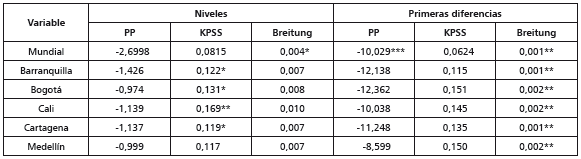 Los resultados anteriores también se obtuvieron con la prueba de Phillips y Perron (1988) y Breitung (1999) (tabla 4). Con la prueba KPSS (Shin et al., 1992) se rechaza la hipótesis nula de no raíz unitaria para el precio minorista del café en Barranquilla, Bogotá y Cartagena, con un 90% de confianza, y para Cali, con un 95%.