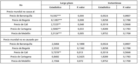 La prueba de Johansen (1988) evidencia que hay una relación de largo plazo entre las series de los precios minoristas del café en las principales ciudades de Colombia y el precio mundial (tabla 5). La misma conclusión se puede obtener con la prueba de Engle y Granger (tabla 6). Dado que todas las series del café minorista están cointegradas con el precio mundial, se puede realizar la prueba de causalidad a lo Granger para todas las parejas de precios (tabla 6).