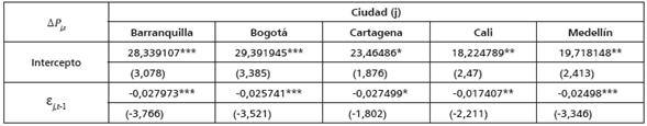 Por último, la ecuación estimada para el modelo de corrección de errores evidencia que la corrección del error es negativa y significativa para todas las series; es decir, cuando el precio minorista observado en cada una de la ciudades está por encima del de equilibrio de largo plazo (Ȇj,t-1 es positivo en la expresión [1]), el sistema implicará que el precio local caerá para el siguiente periodo, de tal manera que el equilibrio de largo plazo se restablezca. En especial desviaciones del equilibrio de largo plazo para Barranquilla, Bogotá, Cali, Cartagena y Medellín son corregidas mensualmente en aproximadamente 2.8, 2.6, 1.7, 2.7 y 2.5 centavos de peso por cada peso de desequilibrio, respectivamente. Esas cifras corresponden al coeficiente del término de corrección de error de la ecuación [1]. En otras palabras, dejando todo lo demás constante, un desequilibrio inesperado toma en las ciudades de Barranquilla, Bogotá, Cartagena y Medellín alrededor de tres años (36 meses) para ser corregido. En Cali, se toman 4 años y 9 meses aproximadamente; es decir, esta ciudad presenta la velocidad de ajuste más baja.