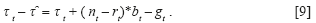 [1]where g is the government expenditure in ratio to GDP, τ is the tax revenue in ratio to GDP, 𝑟 is the real interest rate, 𝑛 is the growth ratio of GDP, 𝑏 is the debt ratio to the GDP.