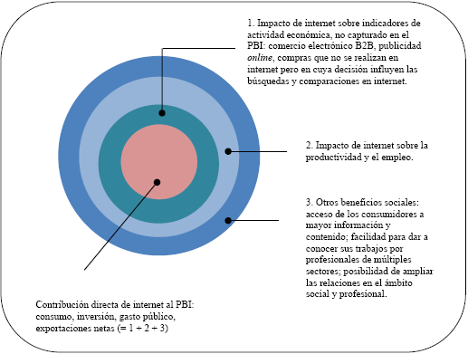 Por otro lado, internet, al afectar directa mente el entorno en que se desarrolla la empresa, influye directamente en la productividad de esta y, por tanto, en el comportamiento económico del país. Asimismo, internet es parte de las tecnologías de la información y comunicación (TIC) de un ne gocio. Si las empresas hacen un uso adecuado de este, no solo para relacionarse con sus compradores, sino con todos los que son parte de su cadena de valor (proveedores, prestadores de servicios, distribuidores), mejoran sus resultados económi cos, y ello tiene un efecto directo en la economía nacional. Al respecto, Pélissié et al. (2011) publican uno de los estudios iniciales acerca del impacto citado sobre el producto interno bruto (PBI) y el crecimiento económico.