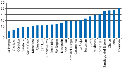 Cómo indica esta gráfica, existen realidades absolutamente dispares entre las distintas provincias del país. Así, mientras el porcentaje de personas en situación de pobreza en Santa Cruz es del 1,1%, en la provincia del Chaco es del 14,2%. Por otro lado, y complementando este análisis, se muestran más de 13 puntos porcentuales de diferencia entre ambos extremos comparativos provinciales; así, en el análisis de la renta per cápita de los habitantes de cada provincia se ve particularmente vislumbrado el grado de contraste y desigualdad entre las regiones de Argentina.
